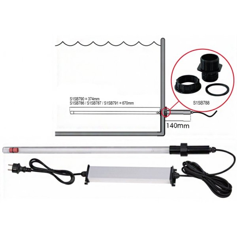 Plastikinis lempos galas turi 32mm. pajungimo diametrą, kad galėtumėte naudoti 32mm. jungtis lempos montavimui į talpą. T5 tipo lempos optimalus veikimas- 9000val., 25,000 μW. Lempa gali būti keičiama, o kvarcinis stiklas ir balastas naudojamas toliau. Galite įsigyti atskirai ir specialią talpos jungtį (papildoma nuotrauka). Montavimui reikalinga 48mm. diametro anga (1½” išorinis sriegis).